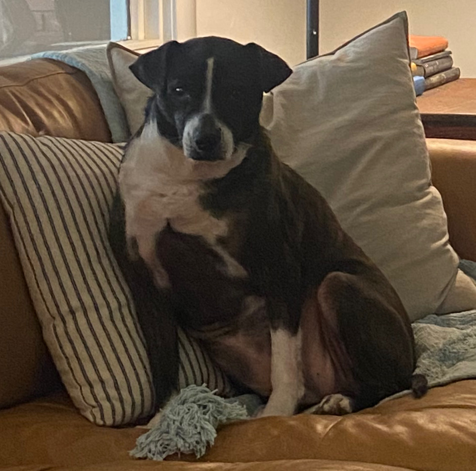 Maria is mostly black with white on her chest and front legs. She’s a very anxious dog and will most likely stay away from people and busy areas.