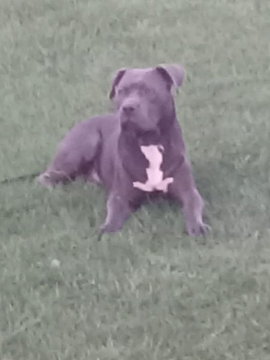 Grey with white chest. Muscular. Friendly.