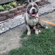 Brindle and white male American bully. not fixed. Looks like he has been out for a while. Proof of ownership is required.