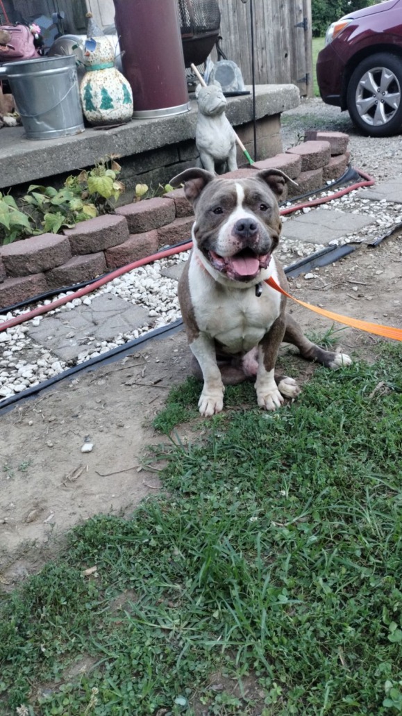 Brindle and white male American bully. not fixed. Looks like he has been out for a while. Proof of ownership is required.