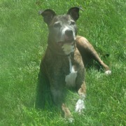 Older brindle terrier mix male. Seems very friendly and calm going house to house and seems confused.