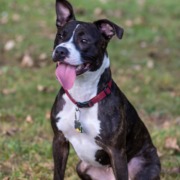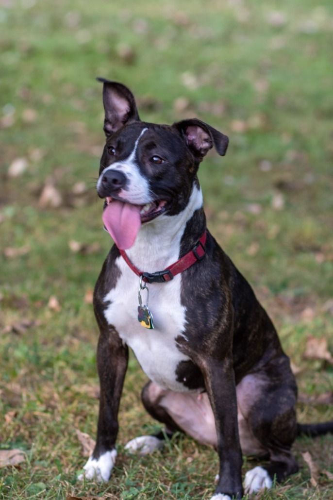 Stout is a female brindle and white pit mix. Friendly with other animals and people. She jumped the fence to play with some other dogs before I could get her in.