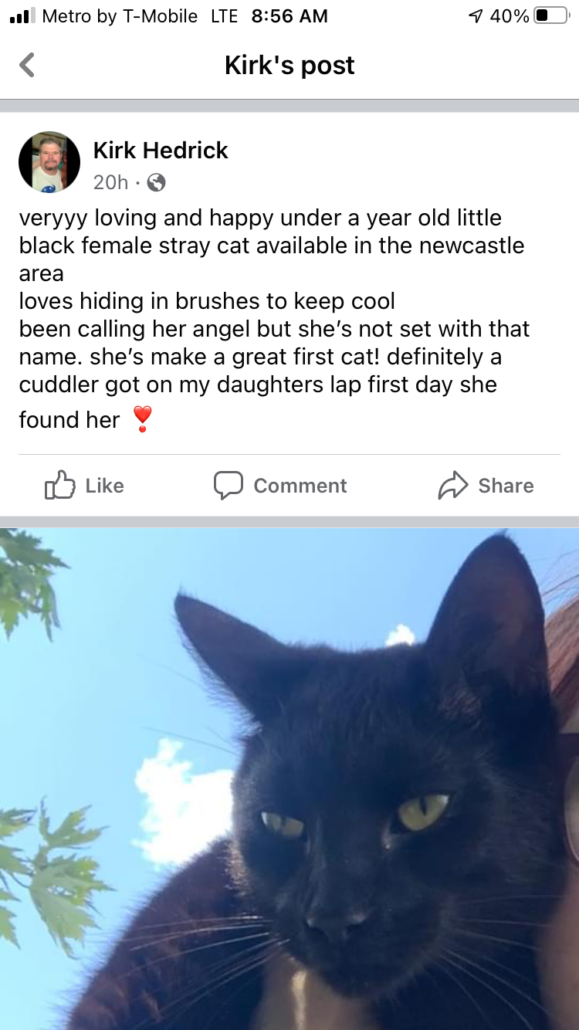 Someone made a post saying they found this cat in Newcastle area and was trying to give it away without taking it to the shelter to be scanned first so I felt I had to make a post so hopefully if you’re looking for your fur baby, you can get a hold of the guy before he gives it to someone.