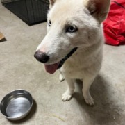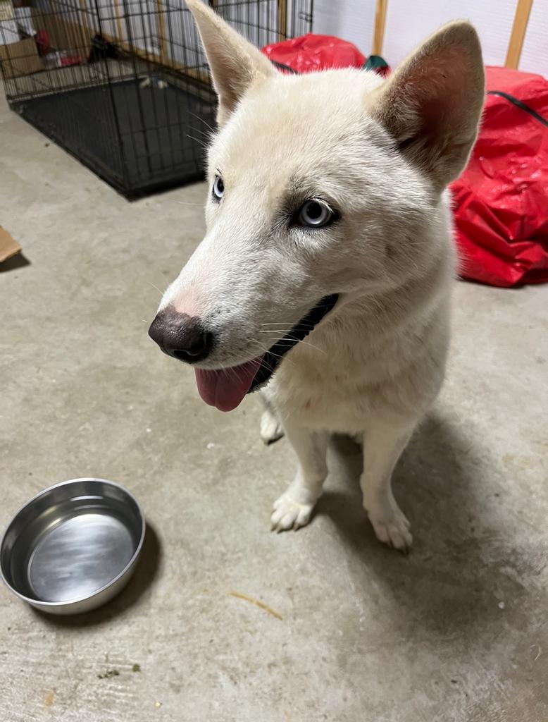 Proof of ownership is required. White Female Husky. Skinny and with fleas. White eyes. No collar. Found with a black female pitbull.