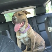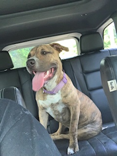 Proof of ownership is required. Sweet brindle girl with a purple collar.