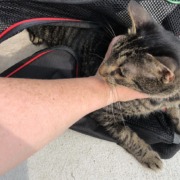 I have another cat in my car with me and nowhere to take this cat inside. We are in shade right now and the cat is in a carrier. It is crying a little bit but otherwise seems OK. I have the cats obviously in different carriers one in the car one outside of the car so they aren’t immediately next to each other and in too much distress.