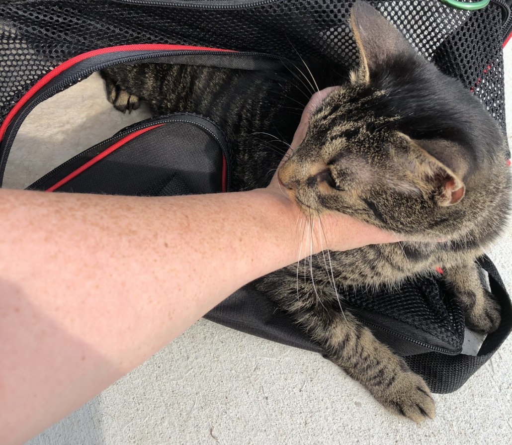 I have another cat in my car with me and nowhere to take this cat inside. We are in shade right now and the cat is in a carrier. It is crying a little bit but otherwise seems OK. I have the cats obviously in different carriers one in the car one outside of the car so they aren’t immediately next to each other and in too much distress.