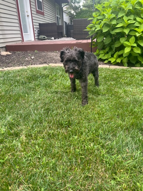 Small black female. Possibly girlie. Purple collar. Docked tail. Speckled gray coloring due to age.