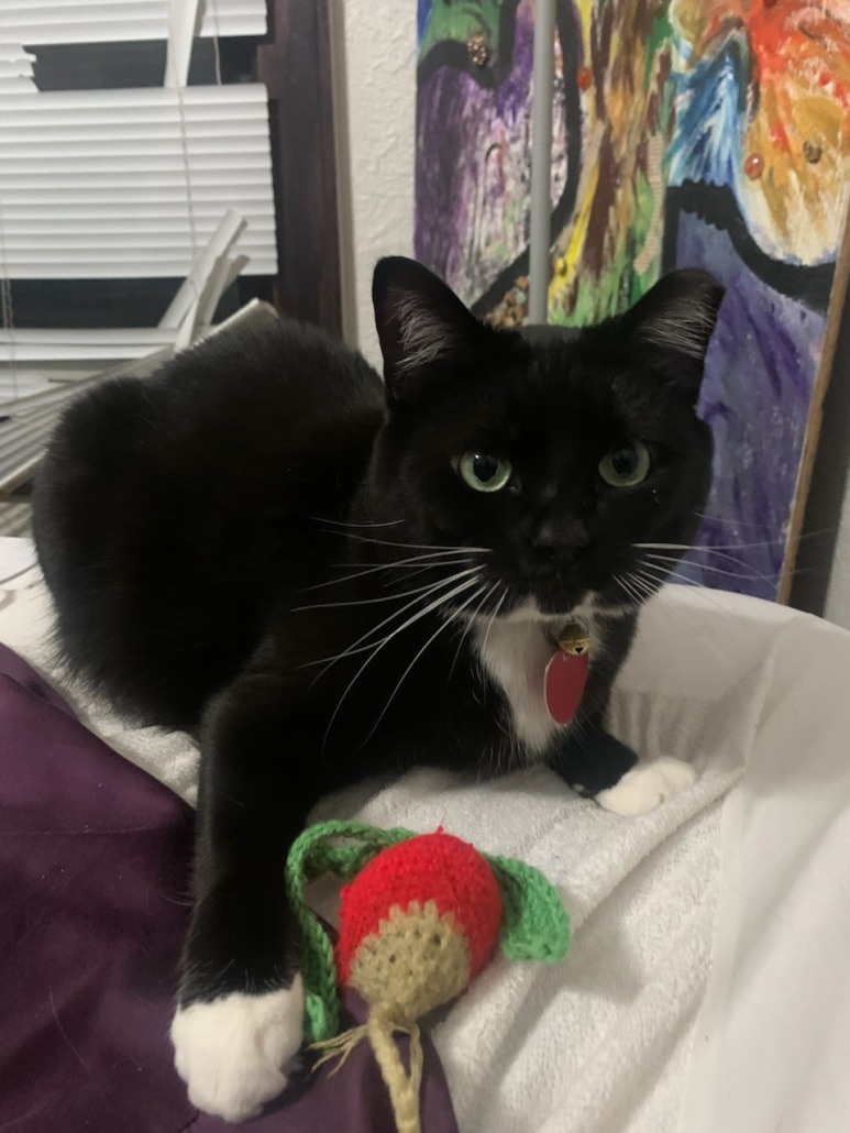 Sweet Tuxedo cat with green eyes and a clipped ear. Was wearing a collar with a bell and rabies tag.