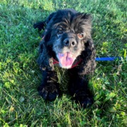 Black cocker spaniel with white chest, mole on back, lump on stomach. Cataracts in both eyes and ear infections. Deaf.