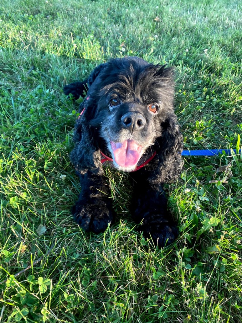 Black cocker spaniel with white chest, mole on back, lump on stomach. Cataracts in both eyes and ear infections. Deaf.