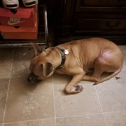 She has red hairless patches whete she had neem scratching on back legs tail and belly
