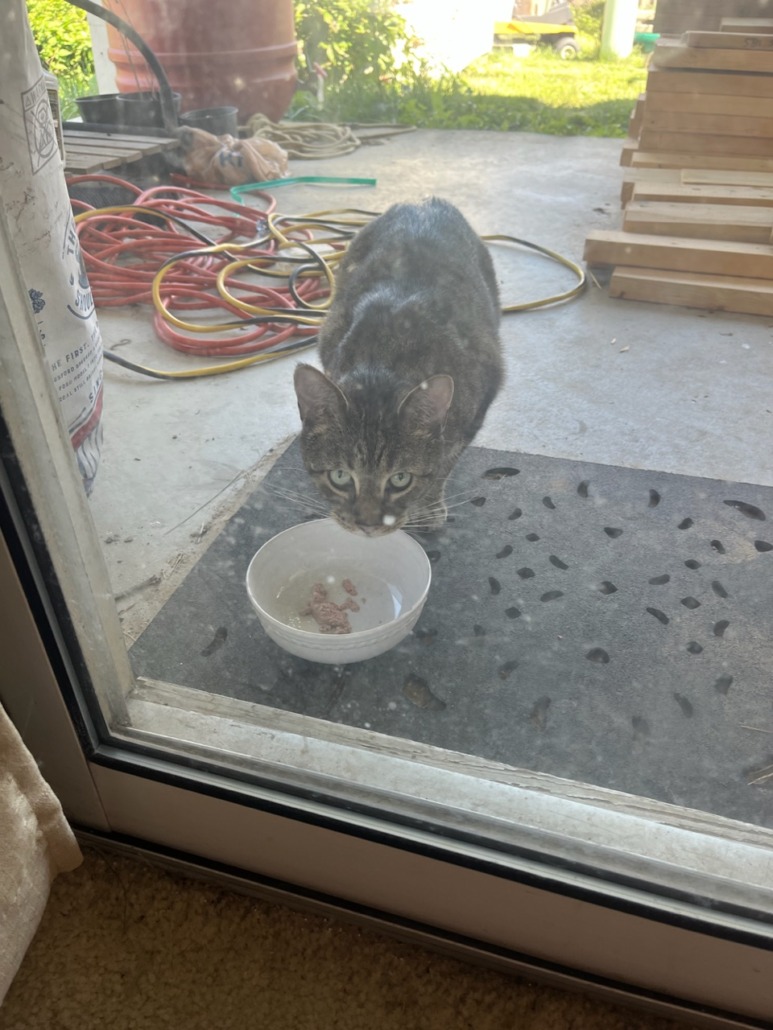 This gray tabby looks to be pretty a male who is pretty strong. He is hiding under a shed we are building. I did feed him wet food (which he ate most of) and set out water. He is pretty skittish right now. He does appear to be a pet but hesitant to get too close.