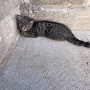 Small kitten, maybe 12 weeks. Grey tabby
