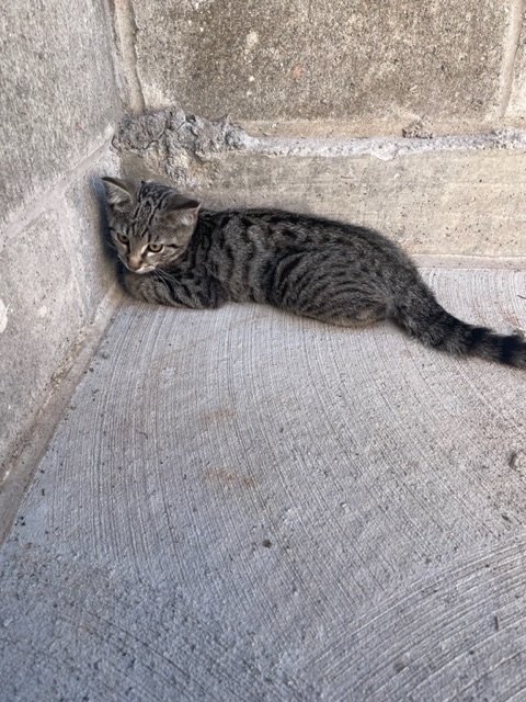 Small kitten, maybe 12 weeks. Grey tabby