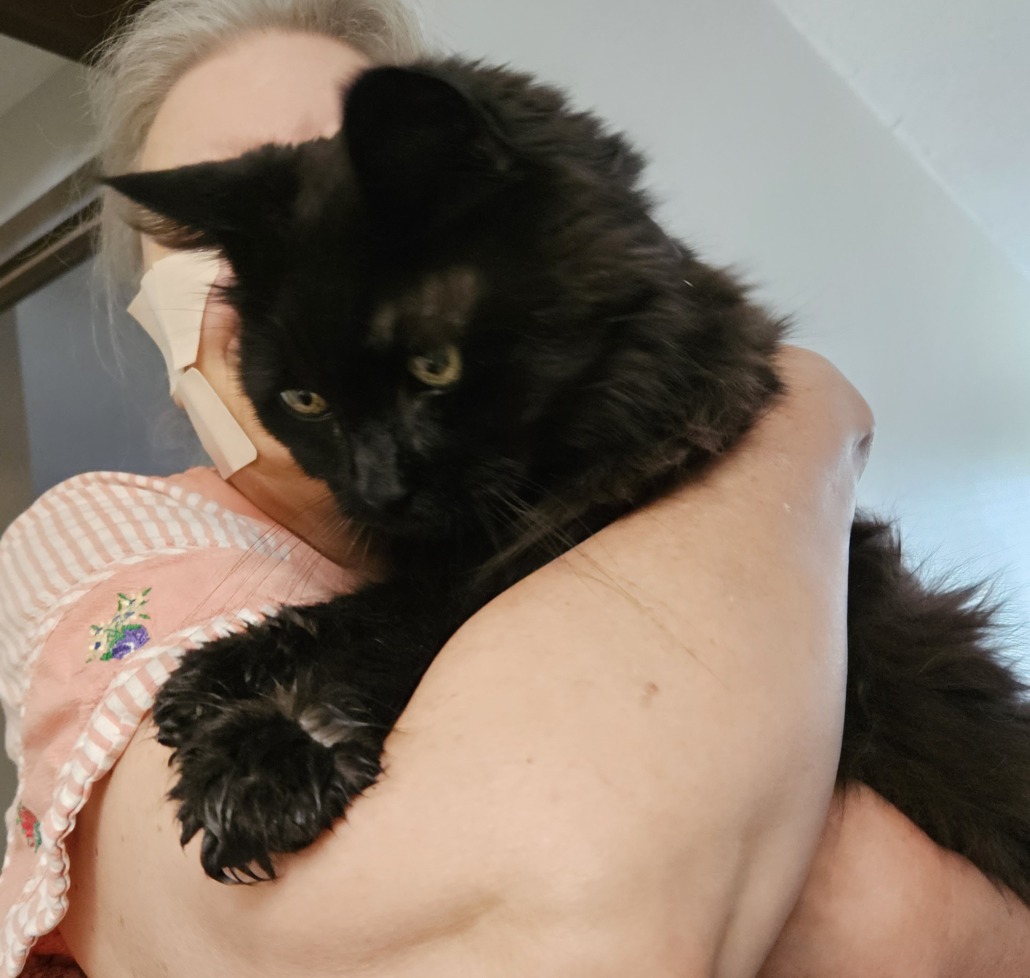 16.5 yrs old, black Maine Coon, thin due to age and diabetes. Insulin dependent! I was his foster before adoption. Just trying to help the owner locate him.