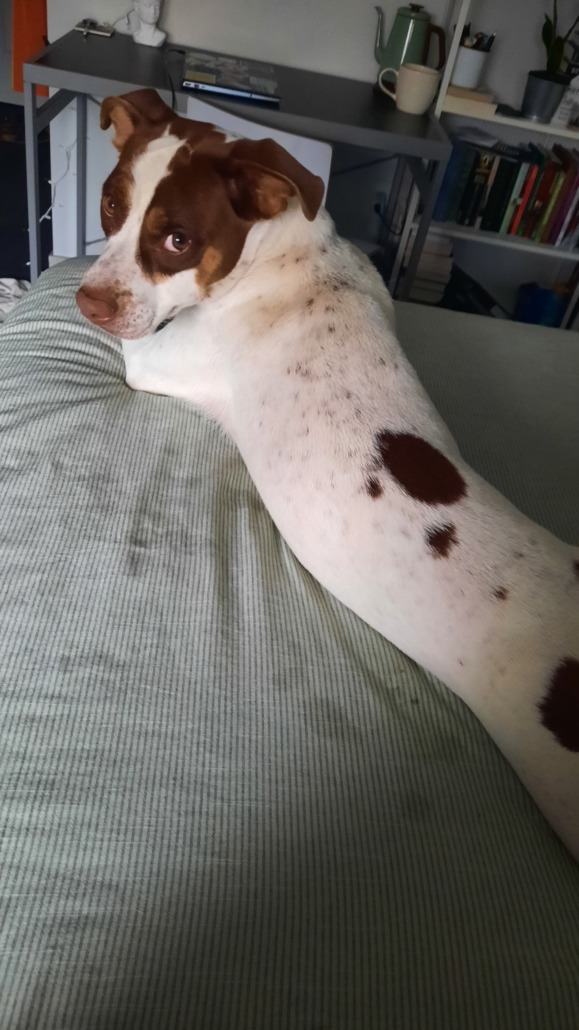 Found medium size mix, mostly white with brown spots on back and face. Very sweet although slightly skittish