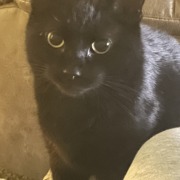 Small black cat, white spot on chest, white specks of fur in black coat , large yellow eyes