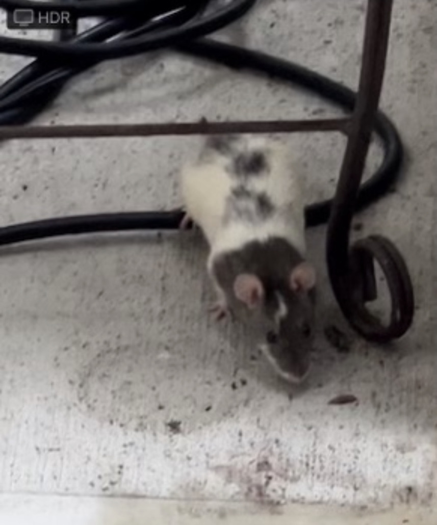 There has been a rat that looks very much like a pet and doesn’t act too scared. It is white with gray markings. Keeps showing up on patio for 2 days now. I Have a humane pet trap set up and food for it to eat.
