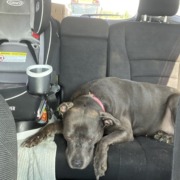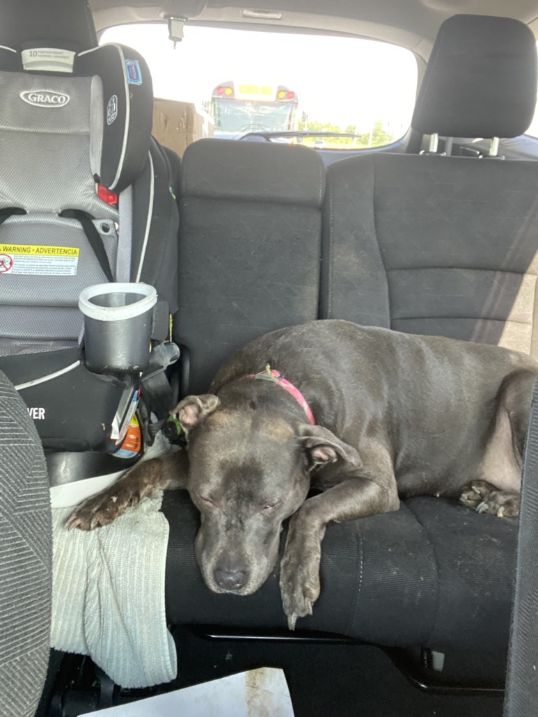 Brown pit mix. Very sweet. Pink collar with bones on it. No tag