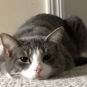 Sweet gray with some white spots, green eyes and pink nose. I was switching collars, from invisible fence to a collar with an airtag and that’s when he decided to escape.
