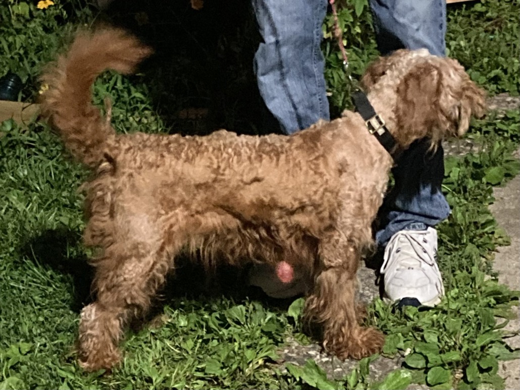 Small tan dog – possibly poodle/terrier/cocker spaniel mix – found in rural McCordsville near 350W and 700N. Has a pink flexi-lead-style leash attached to black Babole collar. Appears to be recently trimmed; has a growth on chest. Friendly, energetic.