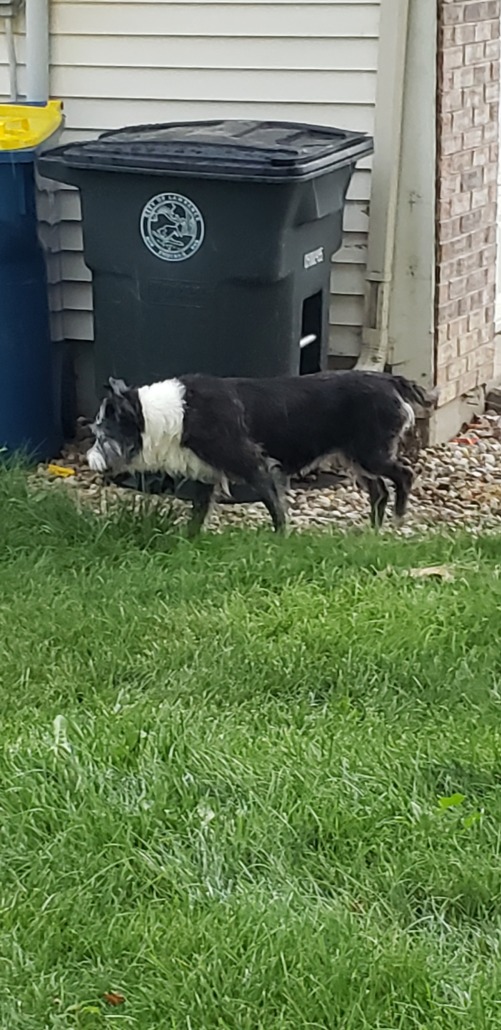Possible shepherd of some kind, about 50 pounds. No collar or tags. Dark grey with white around the neck. Looks like it may have been out for some time, has an odd way of walking as though there is an issue with it’s back legs.