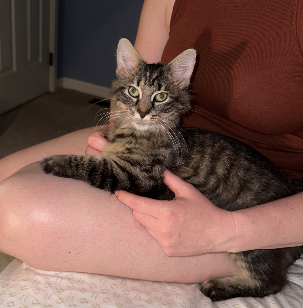 I believe she (?) is around 4 months old. She is fixed and has the green tattoo on her belly. I think it is a female cat. She is a tabby and has a nice temperament. We are reporting here, but will be scanning, if applicable, tomorrow (8/13). Must provide proof of ownership.