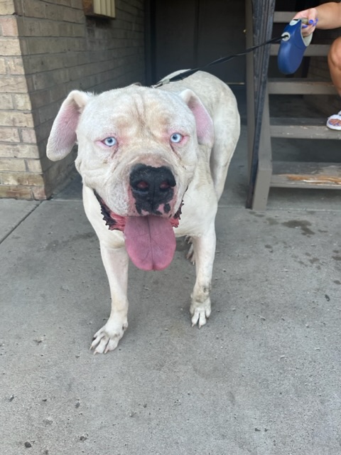 White dog with black spots on belly, male, blue collar, neutered, blue eyes, mild mannered and sweet