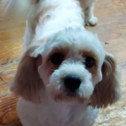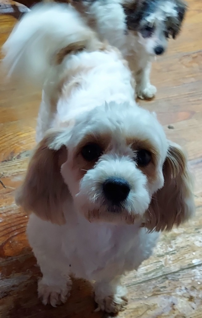 Shishon, mostly white with tan spots on her. Very friendly. Her tail wags all the time. Recently spayed.