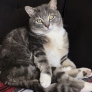 MARLEY is a male cat. He is mostly grey with a white belly/white paws/ and white facial markings. He has BRIGHT yellow/green eyes a darker grey pattern on his body and the dark grey is on his tail in a sort of stripe pattern. He recently was taken to the vet for a cut on his left back shoulder- they shaved a square to get access to it- so there is a somewhat grown out shaven square on his back. He also has a few scratches on his nose from getting into things outside.