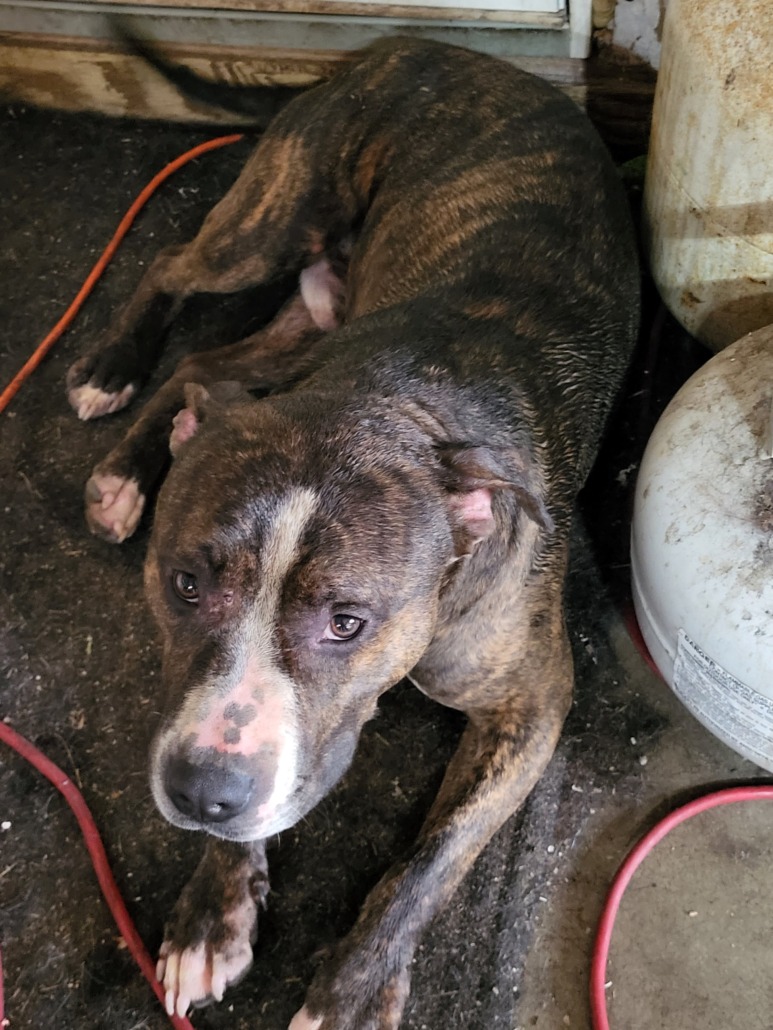 Pit/terrier mix about 20-25 lbs. Has been wandering up and down the street since at least 1 pm today. He is very gentle and friendly. I see him out and about on a fairly regular basis, once a week or so. He has no collar or tags on him. He comes down here quite often and likes to hang out in my garage.