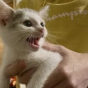 Unknown of gender, very vocal kitten. Looks to be completely white with grey. If yours please be able to identify spots, and/or have proof. (shot records, pics etc.)