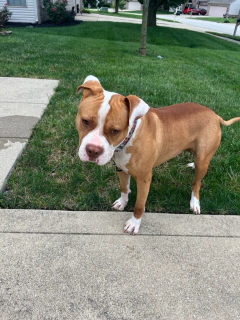 Golden and white unaltered pit mix. Skittish but friendly. Found with the ground stake and lead still attached.