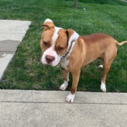 Golden and white unaltered pit mix. Skittish but friendly. Found with the ground stake and lead still attached.