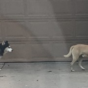 Two dogs running together; Husky with matted fur and tan pit mix with a limp chasing kids in the neighborhood