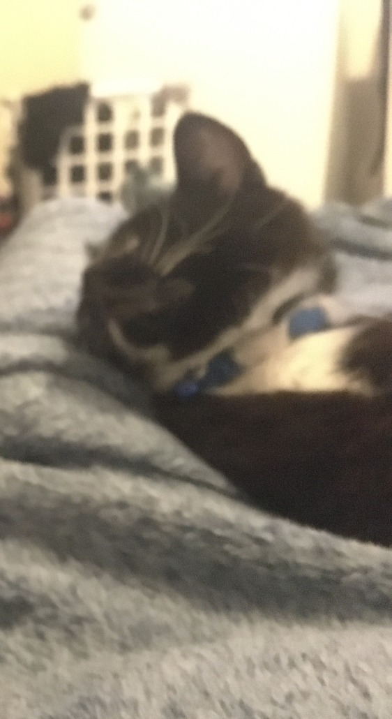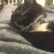 Black with white mittens and white chest had a blue collar on