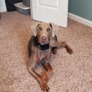 Monty has a docked fail and floppy ears. When we had him he was recovering from a rash on his neck. He has scars on his face and his left front leg