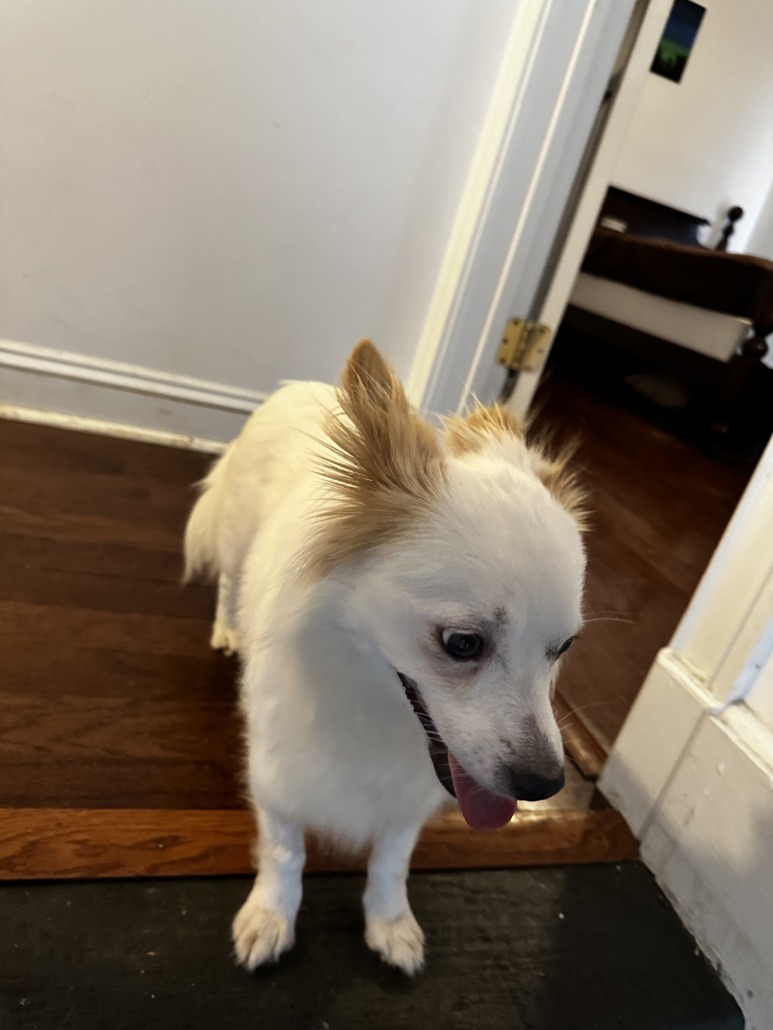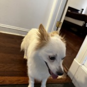 White dog with brown areas. Small and seems to be trained (know a basic commands) very fluffy and well kept fur. Please provide proof of ownership