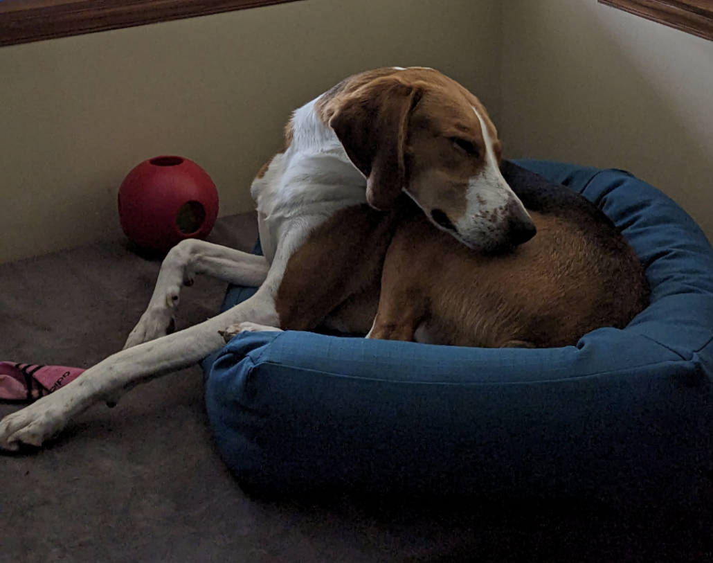 Beagle/foxhound mix. Brown and white. Tall and thin