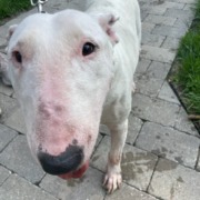 Bull terrier, pink color; tried to call and text number on tag but phone not allowed calls and text did not go through