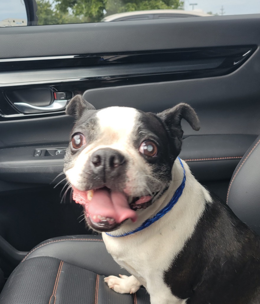 Boston Terrier. Black and white with some brindle. Female. Appears to be blind.