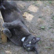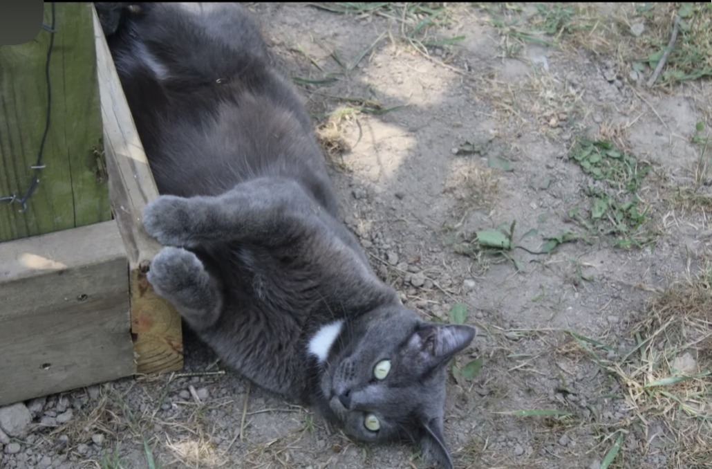 Petite female cat, approx 9#, mostly grey with a white patch on chest; green eyes