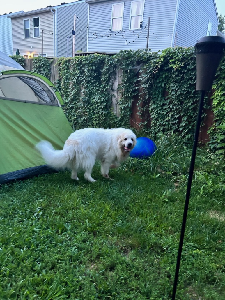 White great Pyrenees found in Buck Creek Village off of 37 and banta. Very sweet and house today and air conditioning. Please provide proof of pet when contacting me. Dog is wearing a robe collar but no tags.