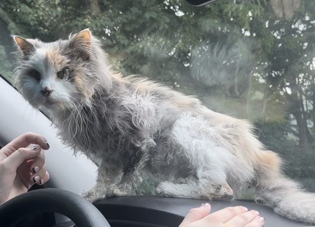 Extremely malnourished. Took to vet, they estimate about 14 years old. Very sweet and human friendly. Chipped but address led to Animal Services in Kentucky.