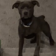 Zeus is a 10 month old gray Cane Corso with a blue collar on.
