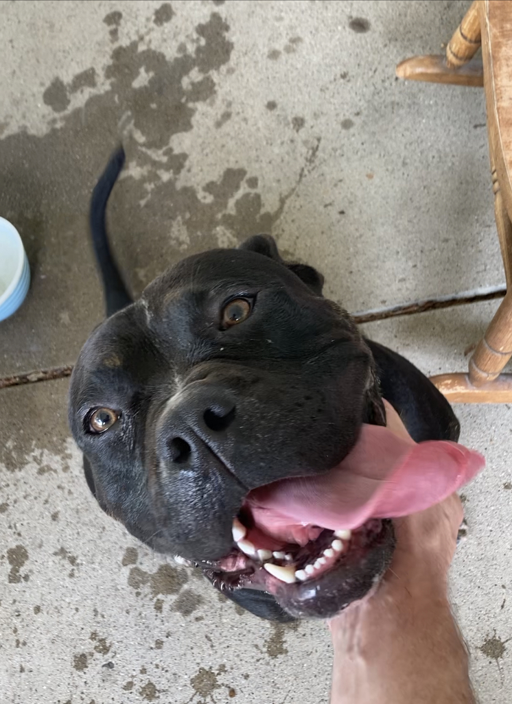 Big black pit bull mix with brindle paws.