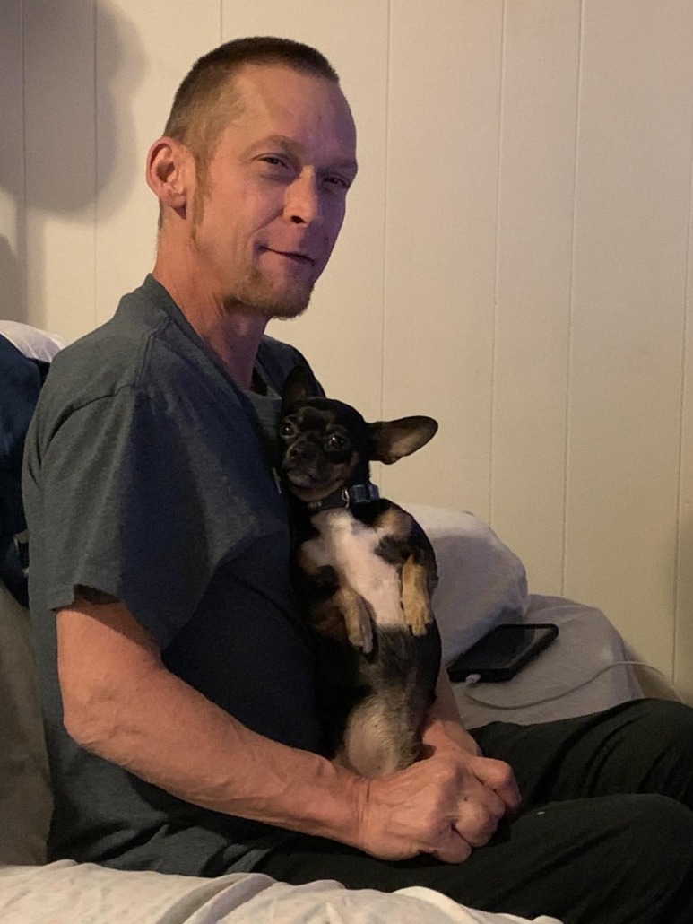 Black with brown face little dog named Angus he is very friendly he is my support dog plz help