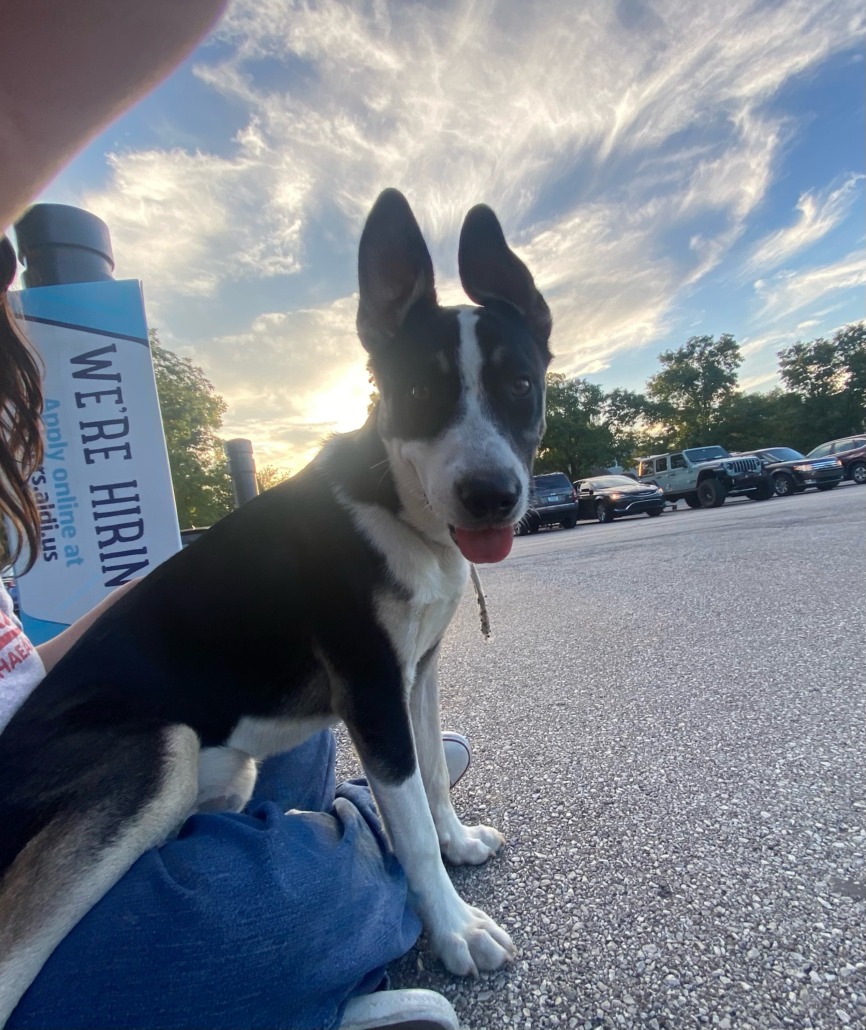 Around a year old puppy, multi colored, sweet affectionate boy. About 50lbs. Pointed ears, one is lop sided. Found at the Aldi parking lot in Irvington.