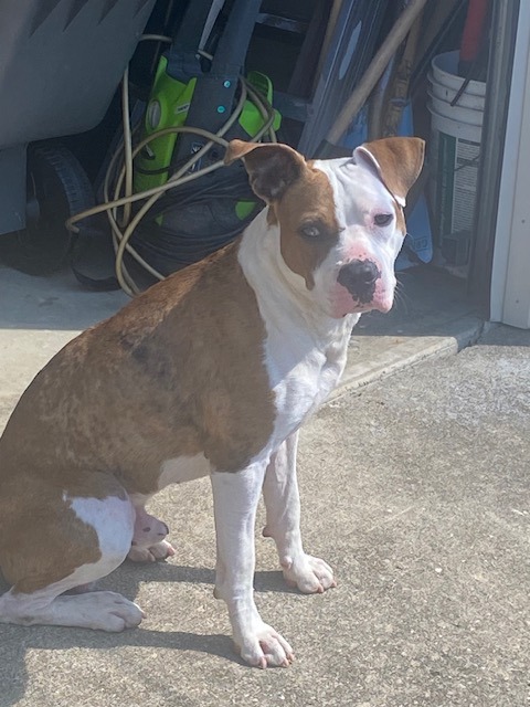 White with tan patches, pit bull, recently manicured nails, very calm and friendly. call 3177759300 (peggy).